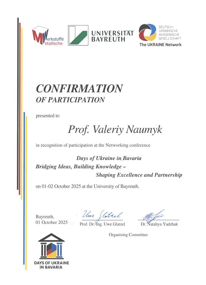 The Days of Ukraine is an annual event organized by the German-Ukrainian Academic Society since 2016 in different federal states of Germany. This year’s Days of Ukraine in Bavaria (Tage der Ukraine in Bayern) took place at the University of Bayreuth on October 1–2, focusing on Bavarian-Ukrainian academic and research cooperation. The event was co-organized by the Department of Metals and Alloys of the University of Bayreuth and aimed to strengthen scientific and educational ties between Bavarian and Ukrainian universities.