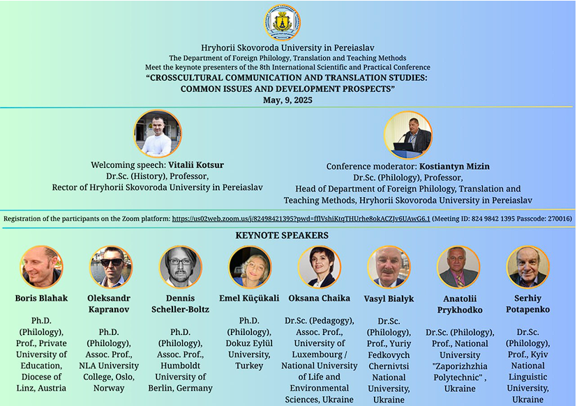 У травні 2025 р. доктор філологічних наук, професор, професор кафедри “Іноземна філологія та переклад” Анатолій Миколайович ПРИХОДЬКО взяв участь у VІІІ Міжнародній науково-практичній конференціії “Міжкультурна комунікація і перекладознавство: точки дотику та перспективи розвитку” в Переяславському державному університеті імені Григорія Сковороди з пленарною доповіддю “Преферентні засоби мовленнєвої виразності в текстах англо- та німецькомовних гімнів”.