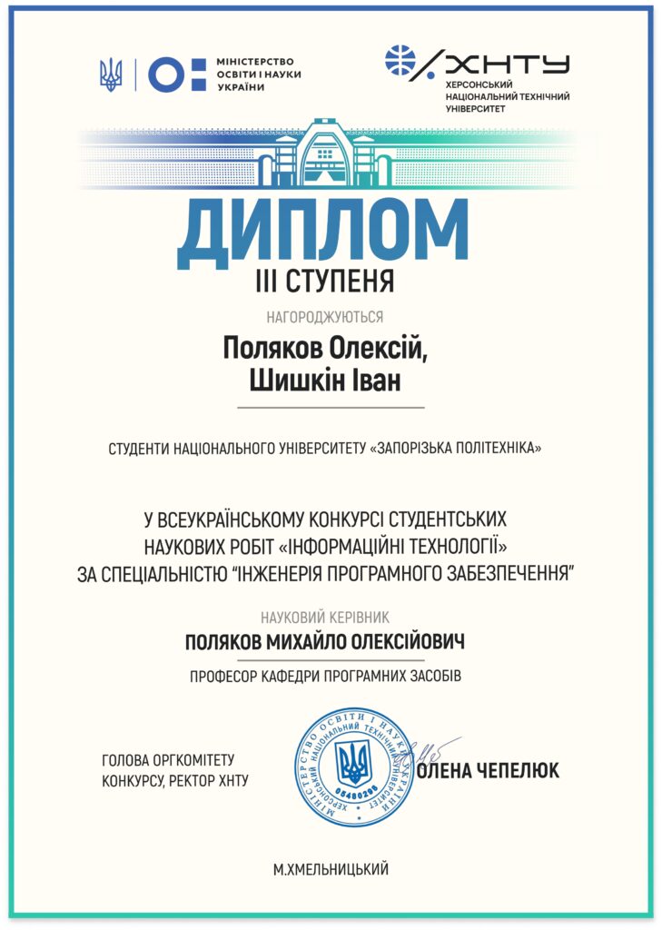 Запорізьку політехніку на конкурсі представили студент факультету комп’ютерних наук та технологій Олексій Поляков та студент електротехнічного факультету Іван Шишкін. Під керівництвом професора кафедри програмних засобів Михайла Полякова студенти підготували роботу на тему «Моделювання та програмування елементів інтегрованих систем мовами промислових контролерів», яку представили за спеціальністю «Інженерія програмного забезпечення».