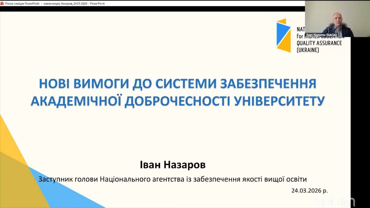 24 березня відбувся Всеукраїнський вебінар «Академічна доброчесність: виклики, проблеми та перспективи», який об’єднав представників закладів вищої освіти, органів державної влади та експертного середовища. Захід проходив за підтримки Національне агентство із забезпечення якості вищої освіти, Національне агентство України з питань державної служби та Національне агентство з питань запобігання корупції.