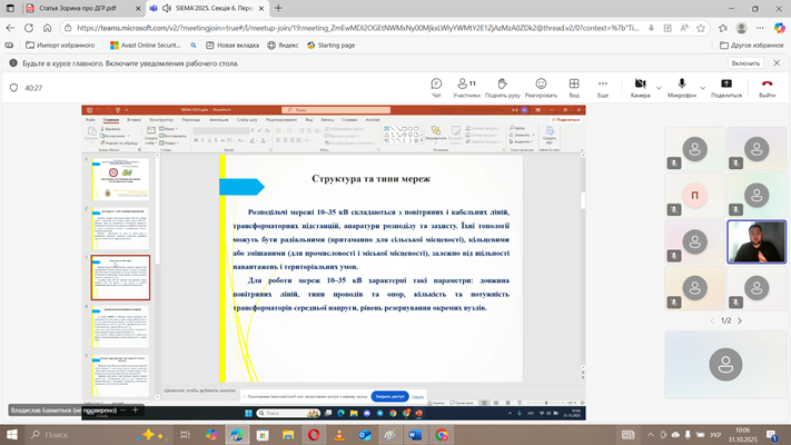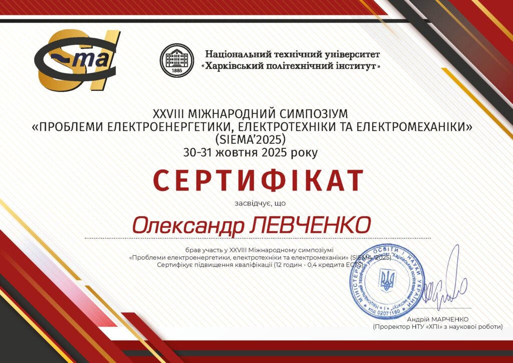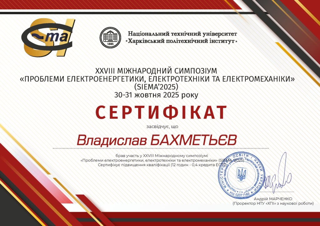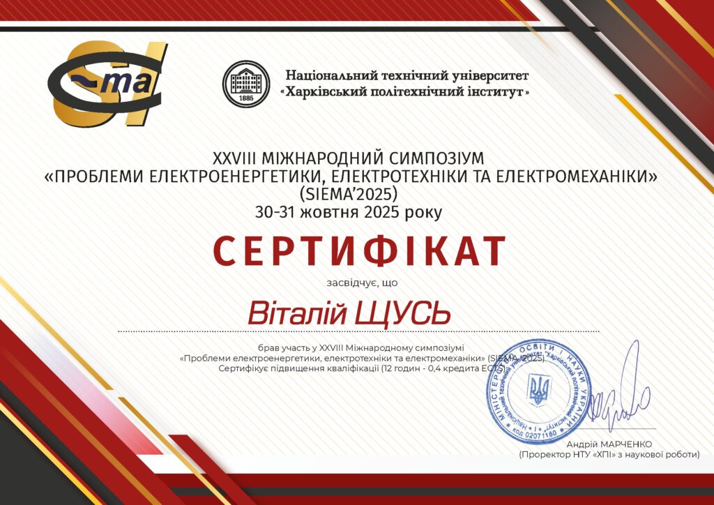 30-31 жовтня 2025 року в НТУ «ХПІ» м. Харків викладачі та аспіранти нашої кафедри взяли участь у Симпозіумі, головною метою якого є висвітлення проблем вдосконалення електроенергетичних, електротехнічних і електромеханічних пристроїв і систем, ознайомлення науковців, викладачів, аспірантів, та студентів з новітніми досягненнями вузів і підприємств України, а також інших країн в галузі електроенергетики, електротехніки та електромеханіки.