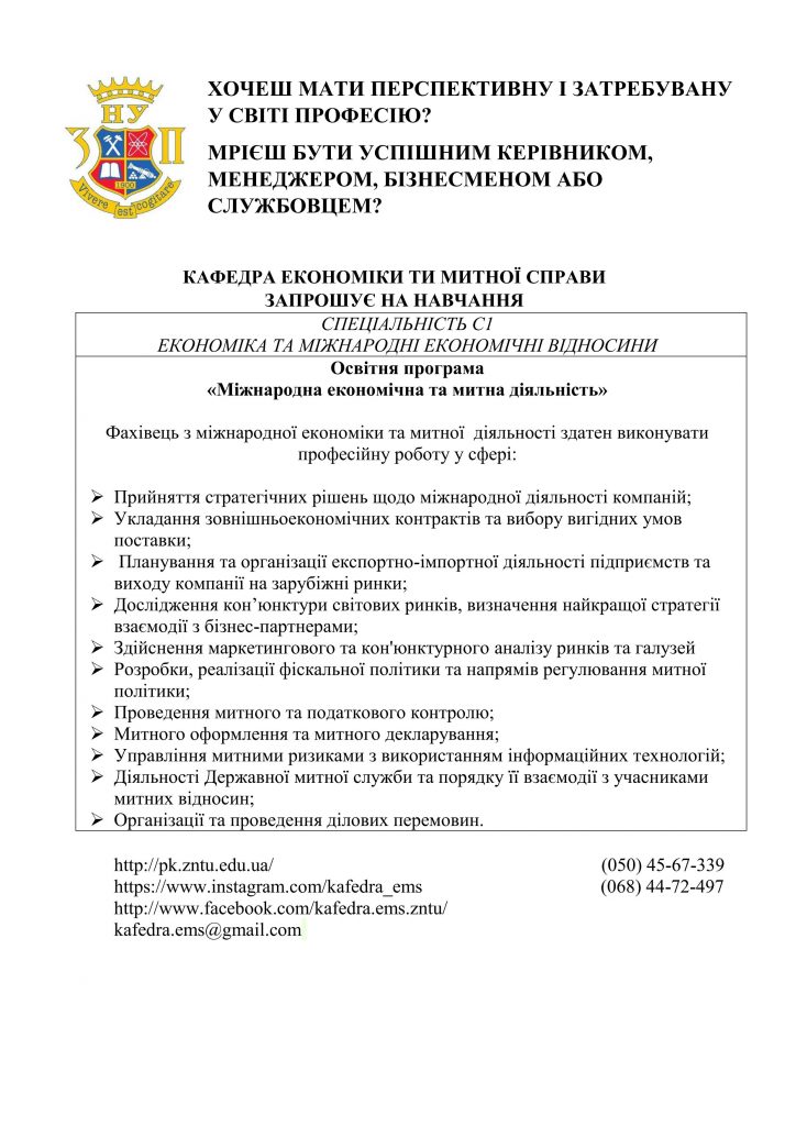 Кафедра «Економіка та митна справа» —запрошуємо на навчання