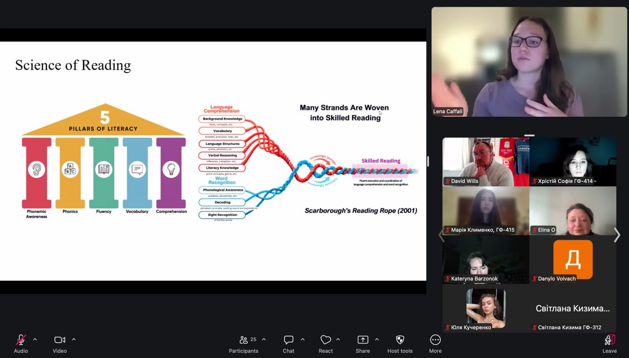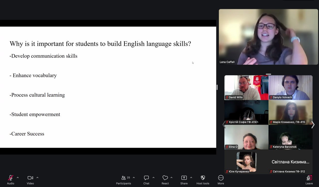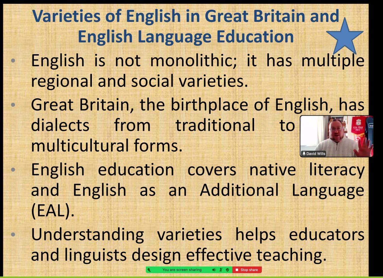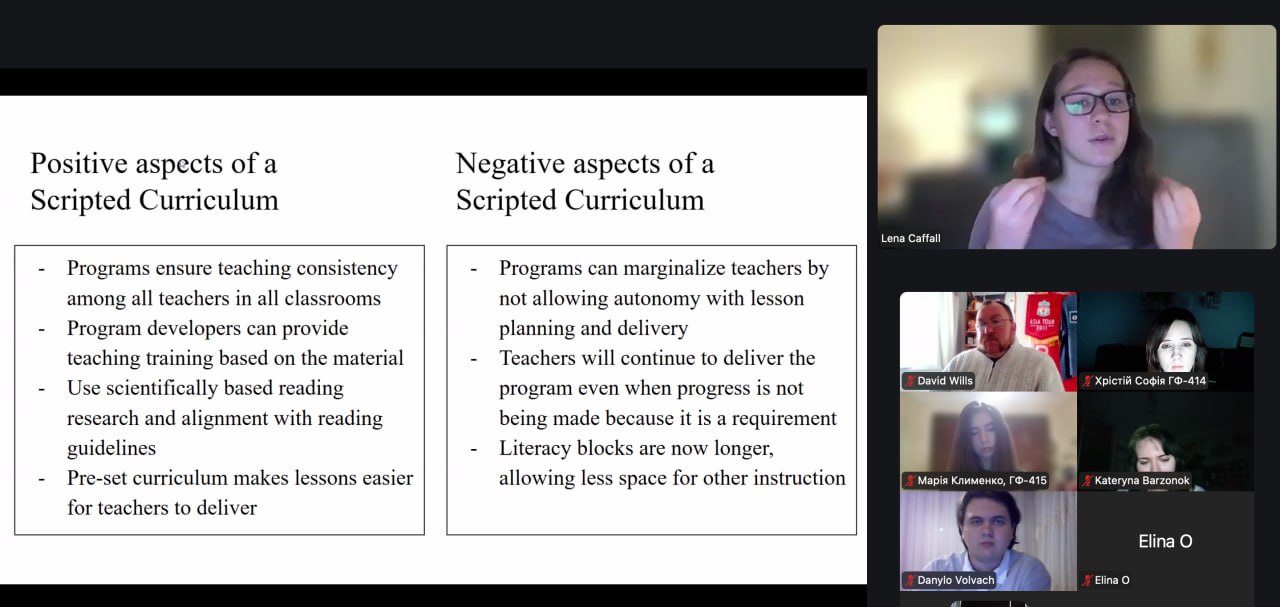 До зустрічі також доєднався британський радник Девід Віллс, який розповів про варіативність англійської мови та специфіку її викладання на різних рівнях у системі освіти Великобританії. Це надало учасникам можливість ознайомитися з особливостями її функціонування у різних країнах і соціокультурних контекстах, зіставити систему освіти у Великобританії та США, послухати та порівняти британський і американський варіанти англійської мови.